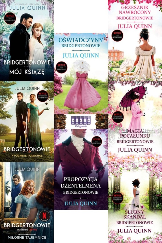 Bestsellerowa seria o rodzie Bridgertonów. Na jej motywach powstał serial Netlixa. W każdym tomie śledzimy życiowe i miłosne perypetie jednego z członków familii.